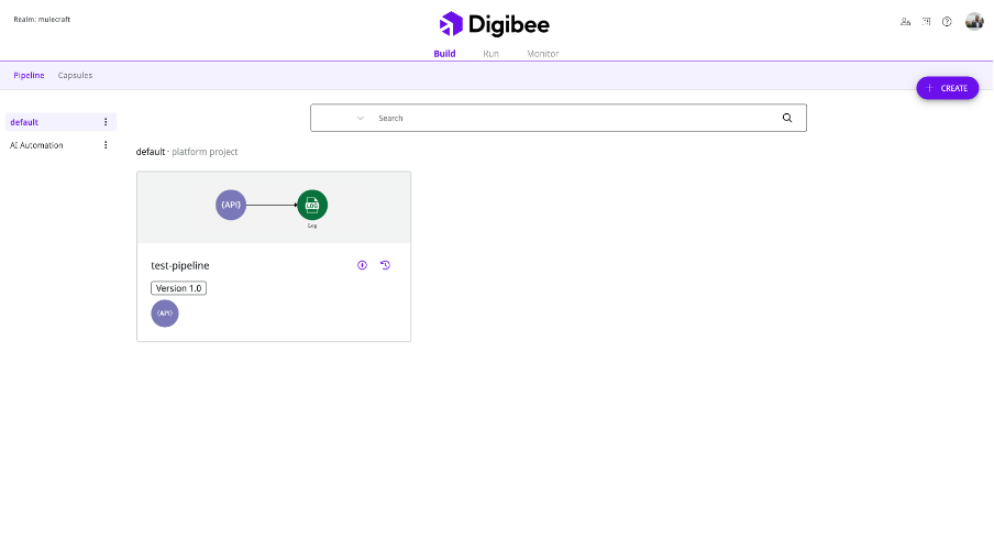 2. After logging in, there will be three tabs below the Digibee logo namely Build, Run and Monitor. Their function is to build your pipeline (integration) in digibee, to deploy and run your pipeline in digibee server and monitor the pipeline logs.