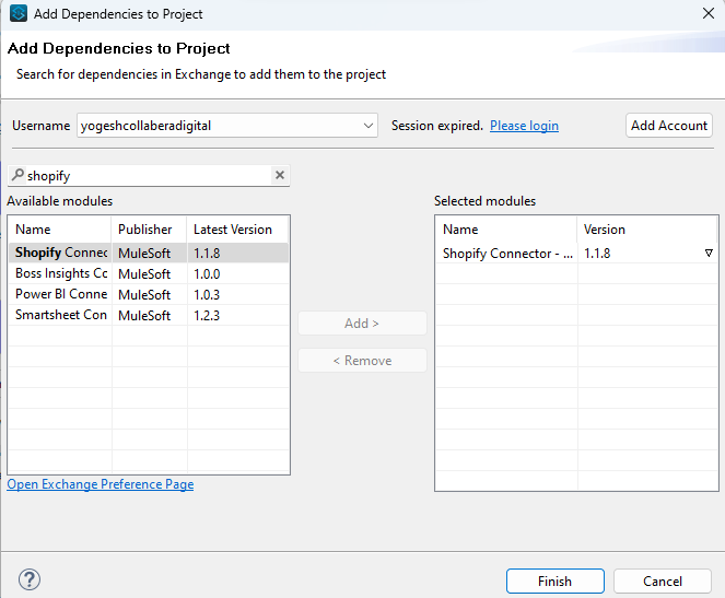Add Shopify Connector: Within the Mule Palette, use the search function in the exchange to look for the Shopify connector. Once found, add the Shopify connector to your project. Alternatively, you have the option to directly include the Shopify connector dependency in the pom.xml file of your project.