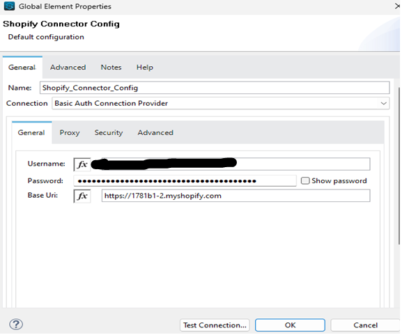 Configure the Shopify Connector: After adding the Shopify Connector, configure it by creating a global configuration that includes your Shopify credentials and connection details. To set this up, access your MuleSoft project, select "Manage Global Elements," and proceed to create a new configuration specific to the Shopify Connector. By using username, password.