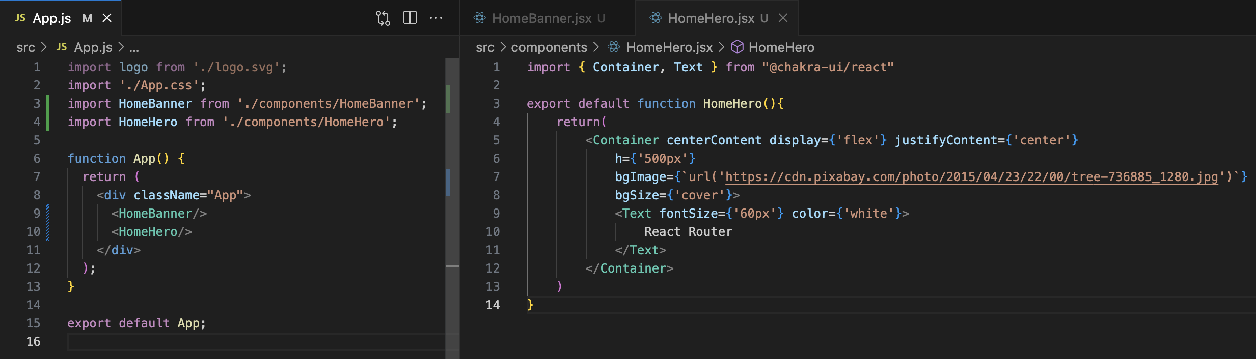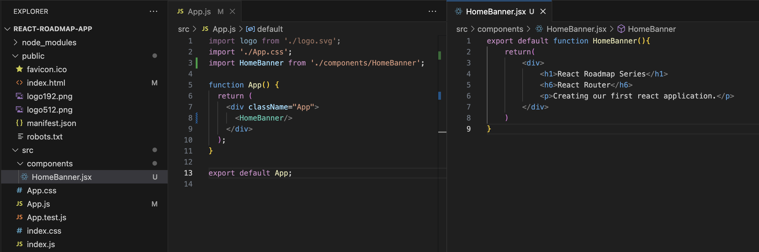 In our previous code, we handled it all in App.js file. Here, I created components folder and a new HomeBanner.jsx file. While writing a component we should export the respective function as shown in the above image. This will help us to reuse the component by importing it at required files. Here, I have imported the HomeBanner function in App.js file and used it efficiently. The output will be however similar to our previous code and that is the beauty of it.