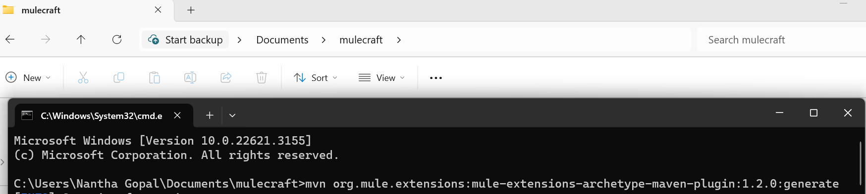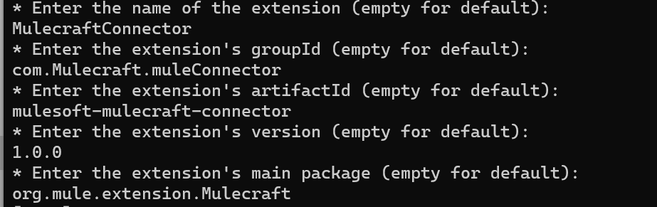 - Run the command mvn org.mule.extensions:mule-extensions-archetype-maven-plugin:1.2.0:generate, where you want to create the project.