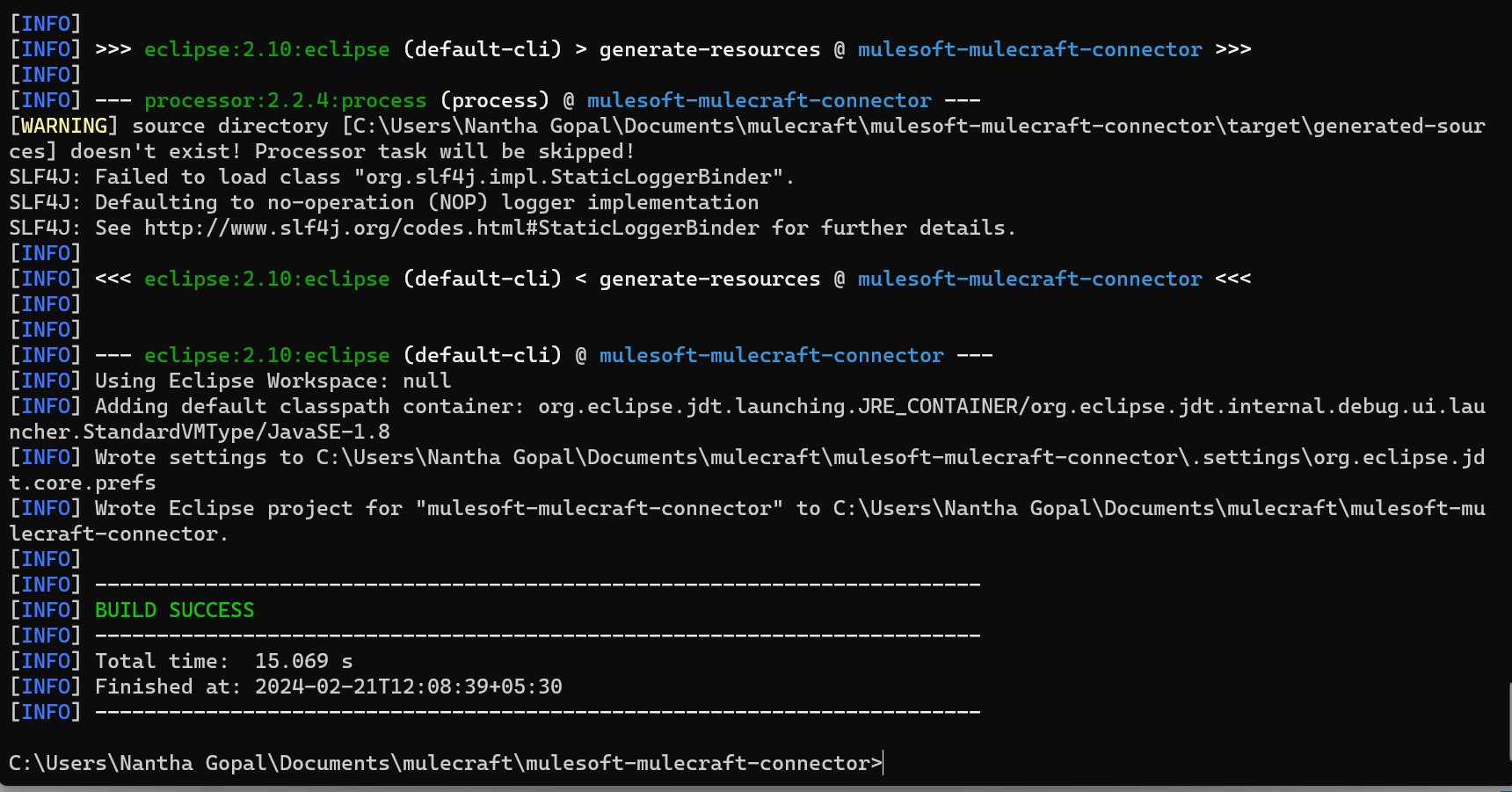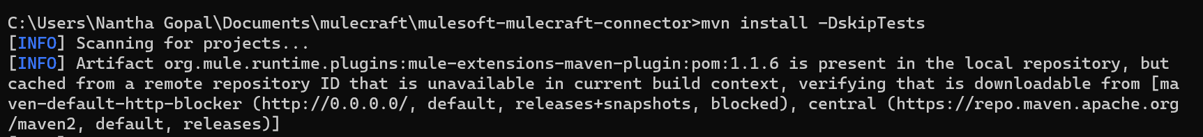 - Perform a clean build of the custom connector project to ensure that it is built from scratch without any residual artifacts from previous builds. This step removes any existing compiled files and temporary build directories. After cleaning, the project is built again, and the resulting artifacts are installed into the local Maven repository or another designated location for dependency management.