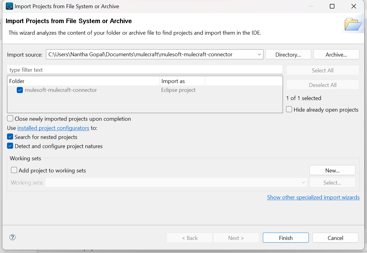 - Import the custom connector project into the development environment, such as Anypoint Studio, by opening the project directory or importing it from version control. This step allows developers to access and modify the connector source code, configuration files, and other project resources within the integrated development environment.
