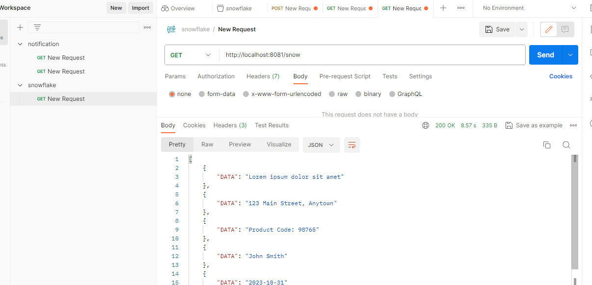 - Using Postman, send a request to the URL "http://localhost:8081/snow" in the same way.