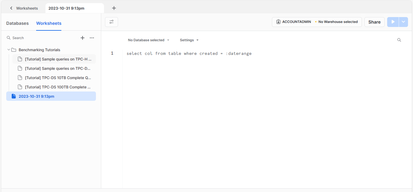 - Snowflake provides some sample databases, listed on the left of the portal.