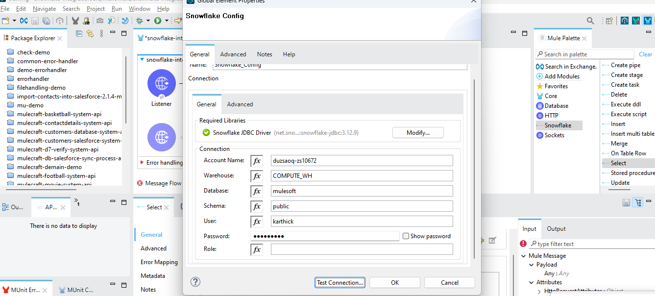 Database: Mention the name of the Snowflake database. In this example, we are using the sample database named "mulesoft"