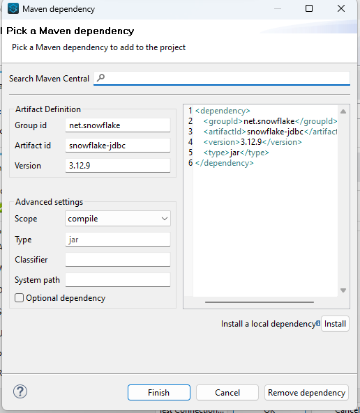 - Configure the Maven dependency with the following details: (Specify the necessary details for the Maven dependency, including the group ID, artifact ID, version, and any other required information as needed for your JDBC driver.)