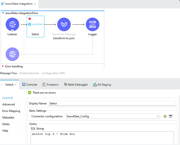 - Include the "Select from Snowflake" component that you previously added from the Anypoint Exchange into your Mule project.