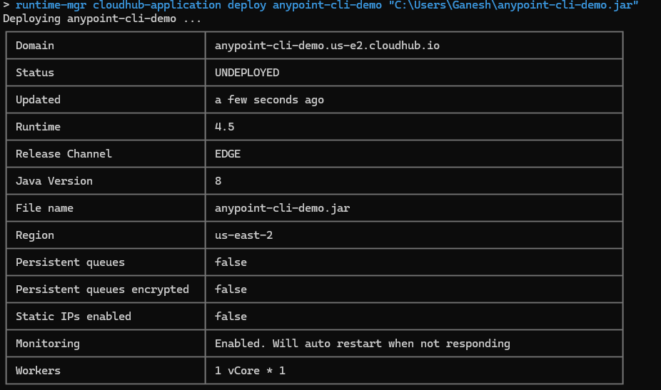 From deploying applications to managing resources, the Anypoint CLI enhances productivity by providing a convenient and efficient interface for developers to interact with the platform. In this blog we are going to see how to deploy using Anypoint- CLI.