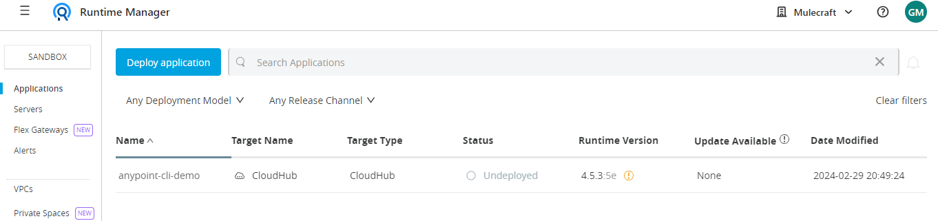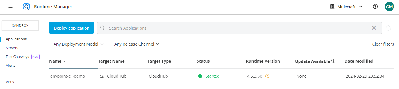 - If the command is executed successfully, we could see the application in the runtime manager under sandbox environment.