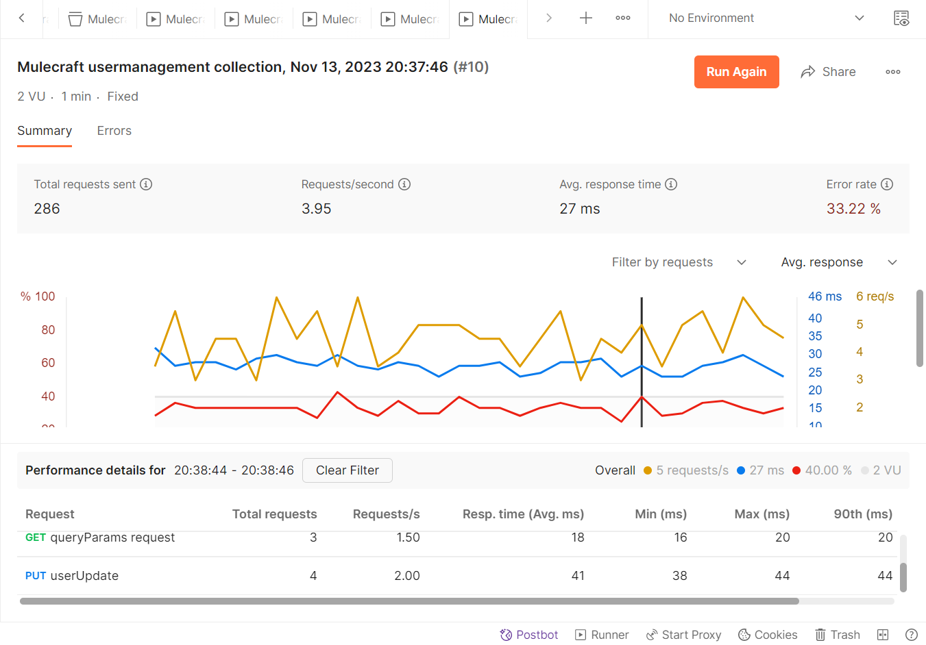 NOTE: Please note that since the virtual users are being simulated locally, there is a limit to the numbers you can simulate without running into memory or other issues. Initially Postman provides 100 Virtual Users(VUs)