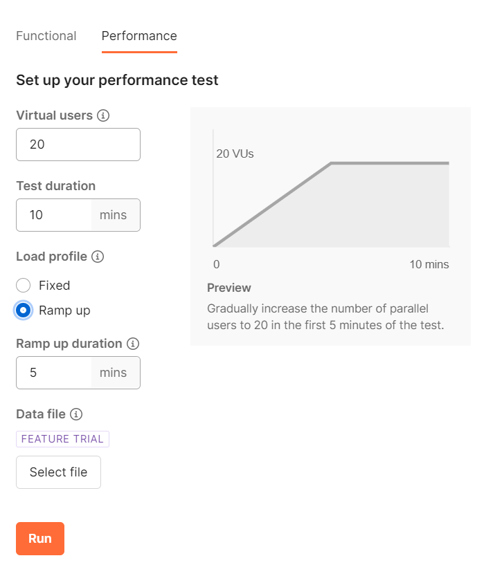- Virtual users (VUs): Virtual users are the parallel users that will hit your APIs at the same time. Each virtual user executes the selected sequence of requests in the collection in serial order as represented on the Collection Runner. Multiple virtual users will run this sequence in parallel, creating a load for your API workflows.