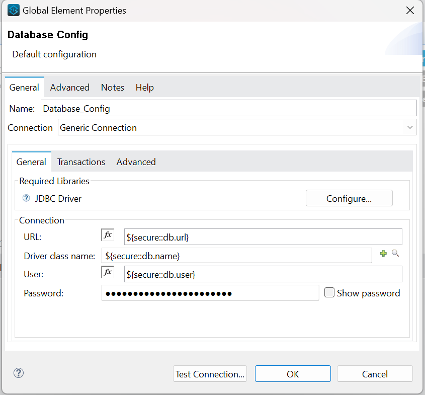 <db:generic-connection url="${secure::db.url}" driverClassName="${secure::db.name}" user="${secure::db.user}" password="${secure::db.passwordl}" />