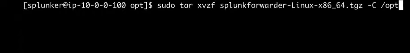 Splunk can live in any accessible directory. In this demo we’ll install in the “opt” directory, so let’s untar the archive there.