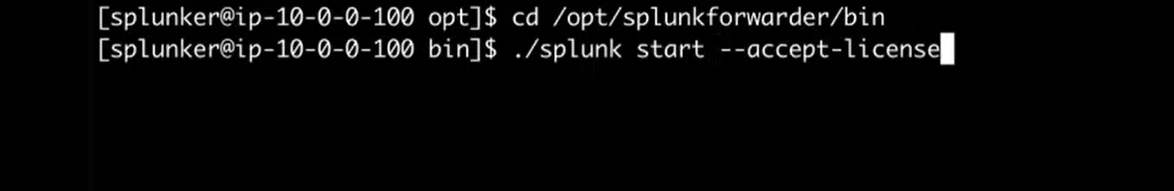 We then navigate to the “bin” directory inside the “Splunk forwarder” folder. The bin directory is where we can run the executable command “Splunk”. We start the forwarder for the first time using “Splunk Start” command. We want to automatically accept the license, so we add the optional “accept-license” argument.