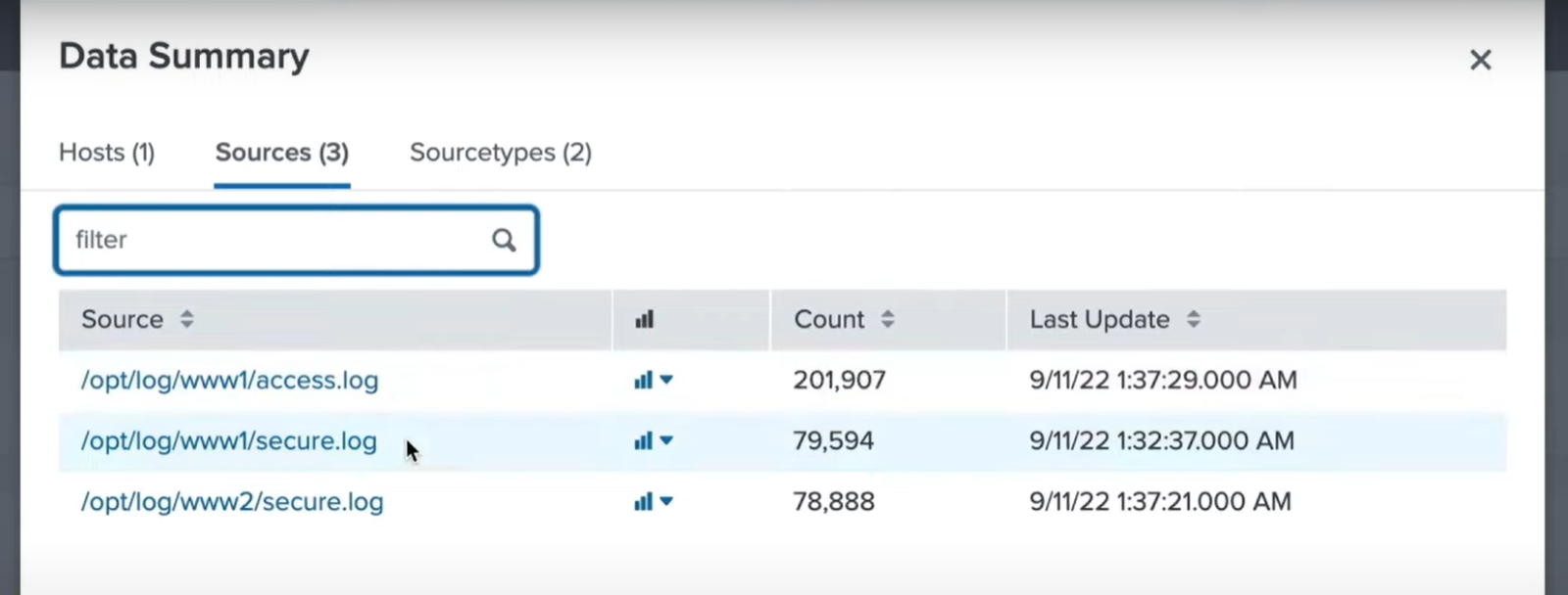 We click on “Data Summary” to verify the data is being indexed on our Splunk Enterprise instance.
