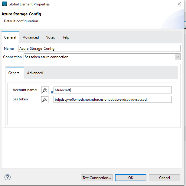 In the Anypoint Studio configure the Azure Storage Connector configuration with the created storage account name and SAS Key . Once you completed the configuration you have to create a container.