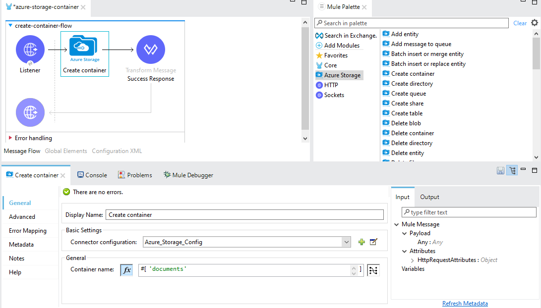 In your Mule flow, add an "Azure Storage Create Container" operation. You can do this by dragging and dropping the Azure Storage Connector to your flow .Configure the operation with the necessary parameters:
