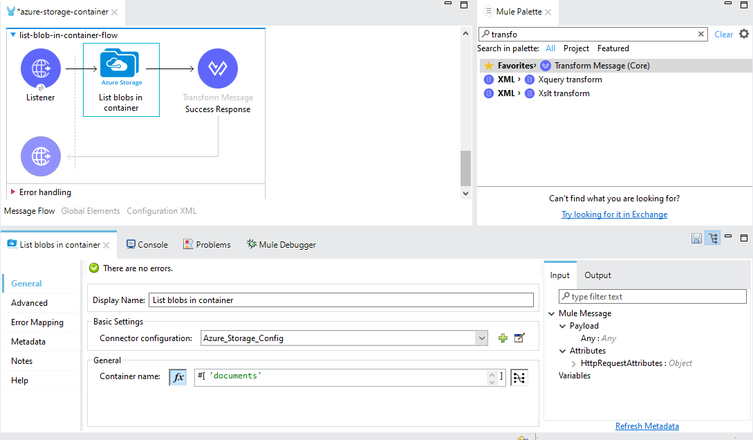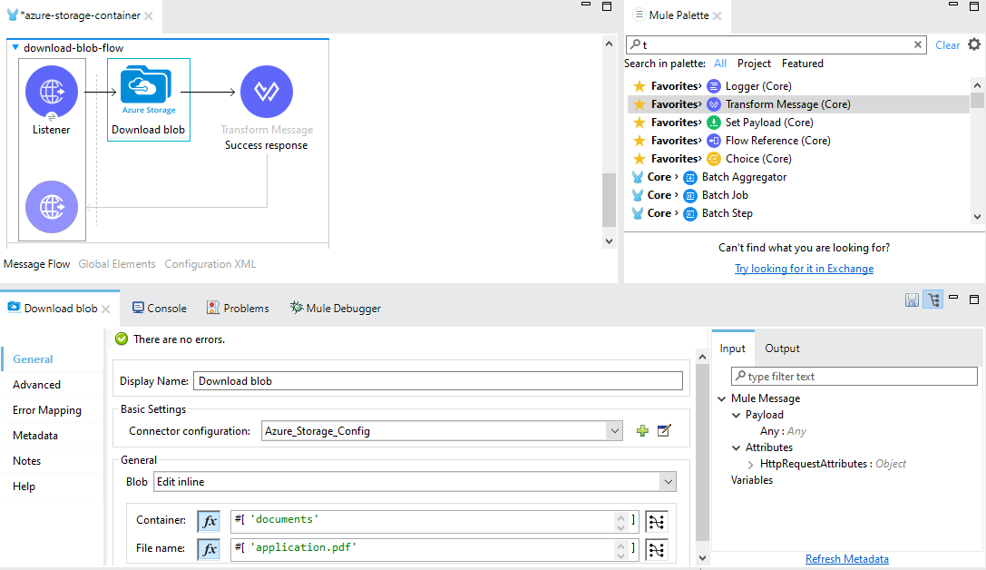 - Like uploading a blob , you have to set the basic setup like creating a mule flow and include the download blob logic.