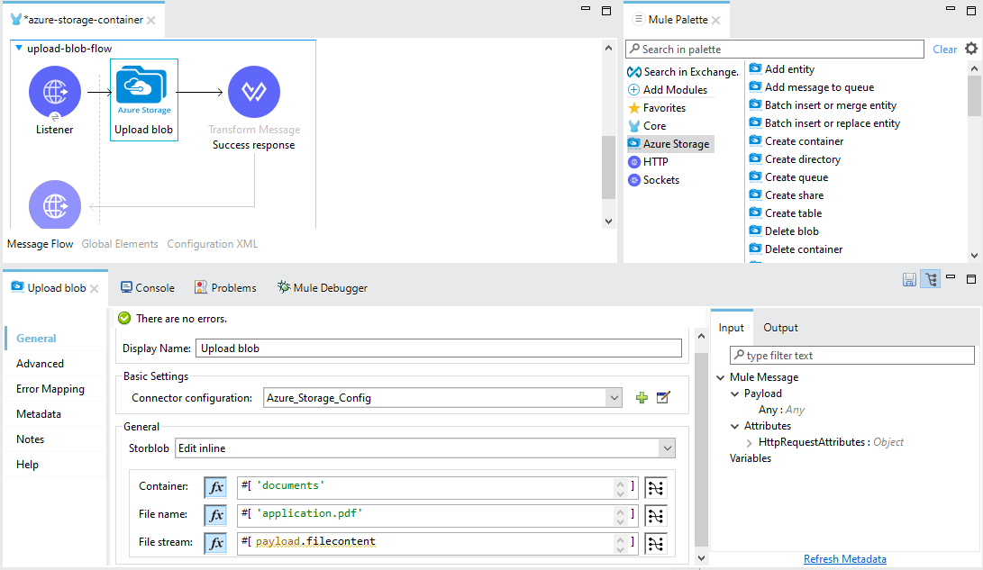 - Create a new mule flow and include the logic for uploading a blob to a container.