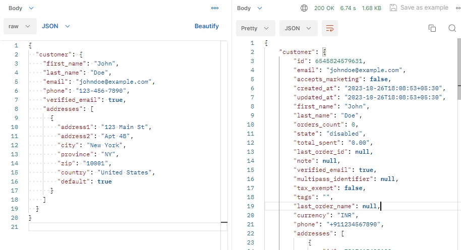 After hitting the API URL, we will receive the customer details of mentioned customer id as mentioned below.