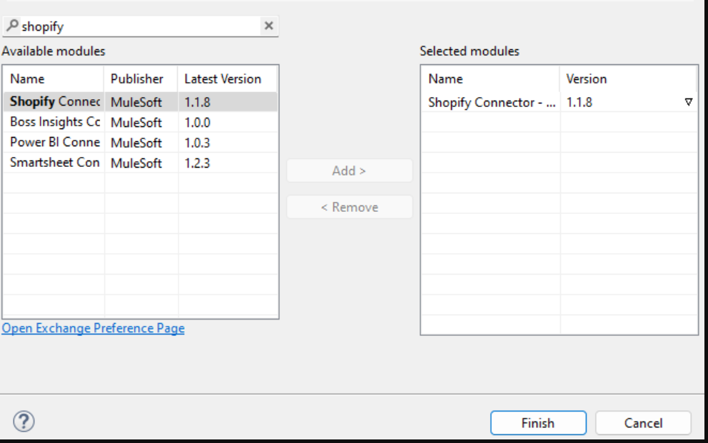 Add Shopify Connector: You can utilize the search feature within the Mule Palette to locate the Shopify connector in the exchange. Once identified, incorporate the Shopify connector into your project. Alternatively, you can opt to directly integrate the Shopify connector dependency into the pom.xml file of your project.