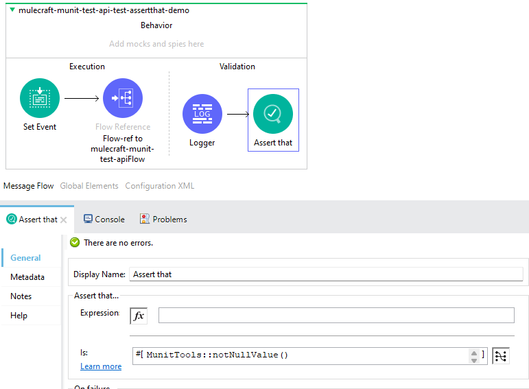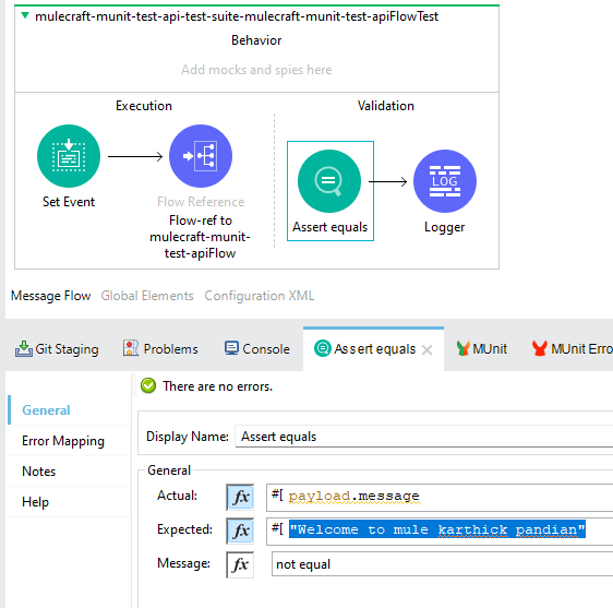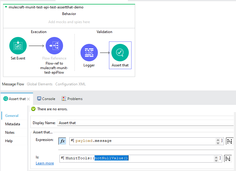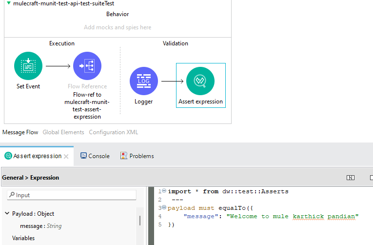 In Assert we have a field called Expression. Here we need to provide what we would like to assert, I would like to assert payload.message which we used in main flow already, by default it gives a notNullValue(), but I wanted to equal assertion in assert for that component.