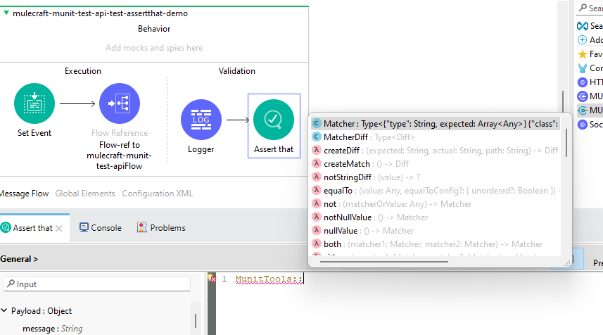 Let’s see what functions are available from assert of that MUnit tools. The syntax is MunitTools:: , let’s go dataweave and remove notnullvalue() and click ctrl+space and you can see all the available for assert of that function.