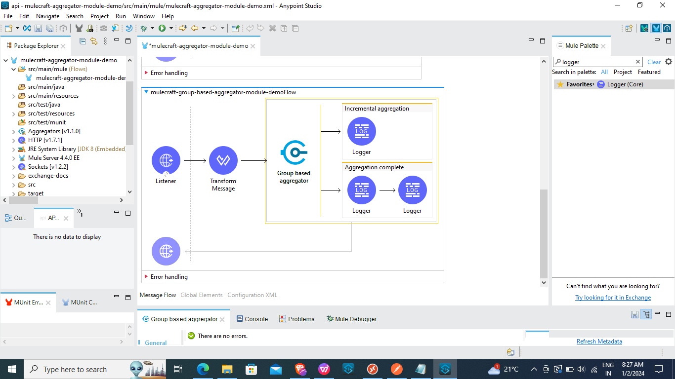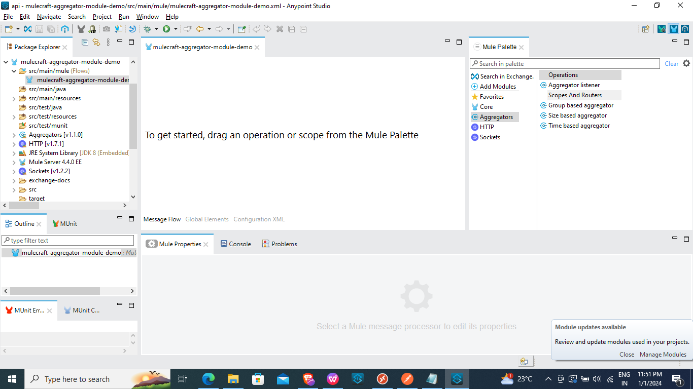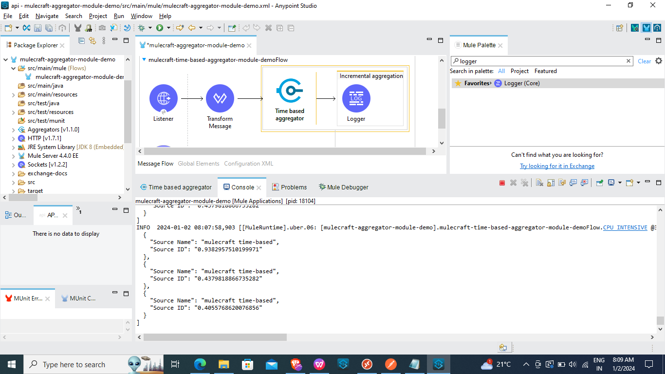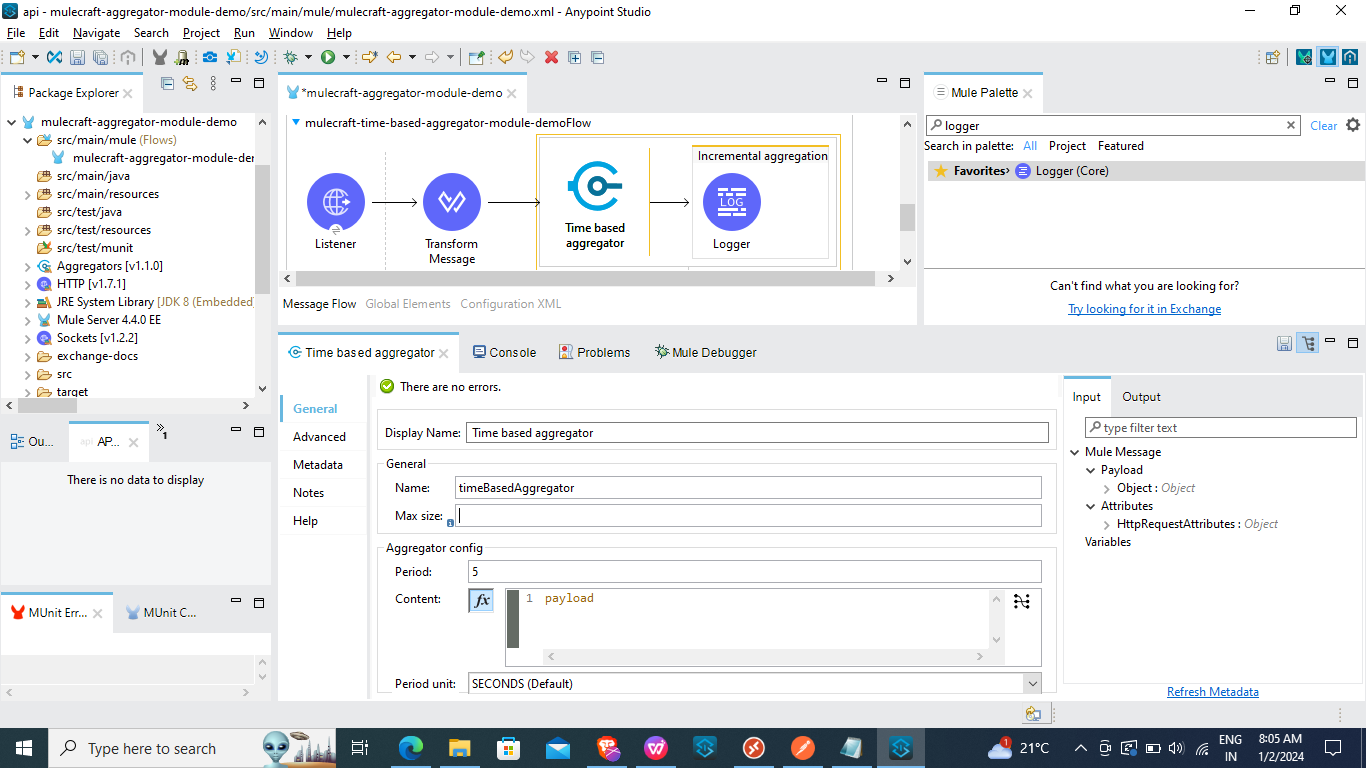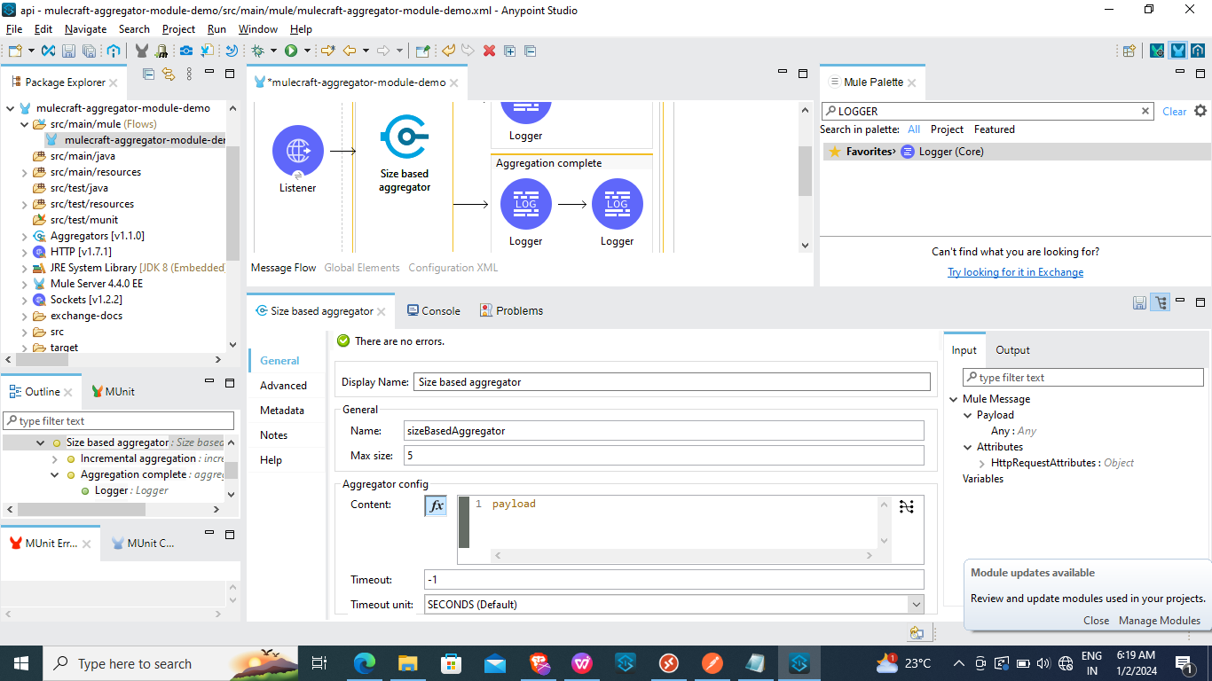 First of all you need to download the aggregator module from Exchange. You could find the aggregator module in Mule palette.