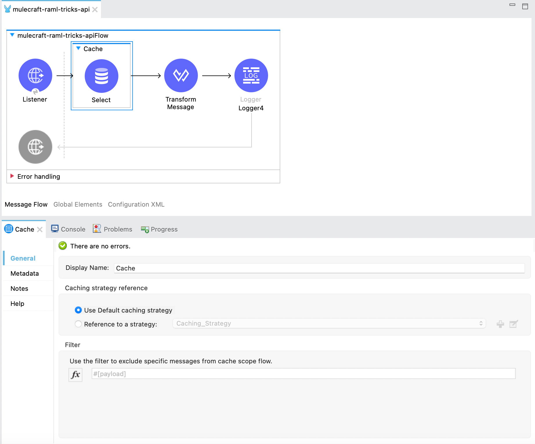 Here, I have enclosed the Select connector inside the Cache scope. The Select operation is based on a query parameter. I have used the default caching strategy.