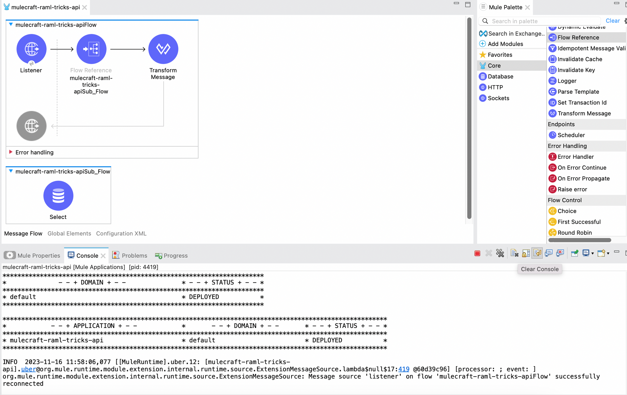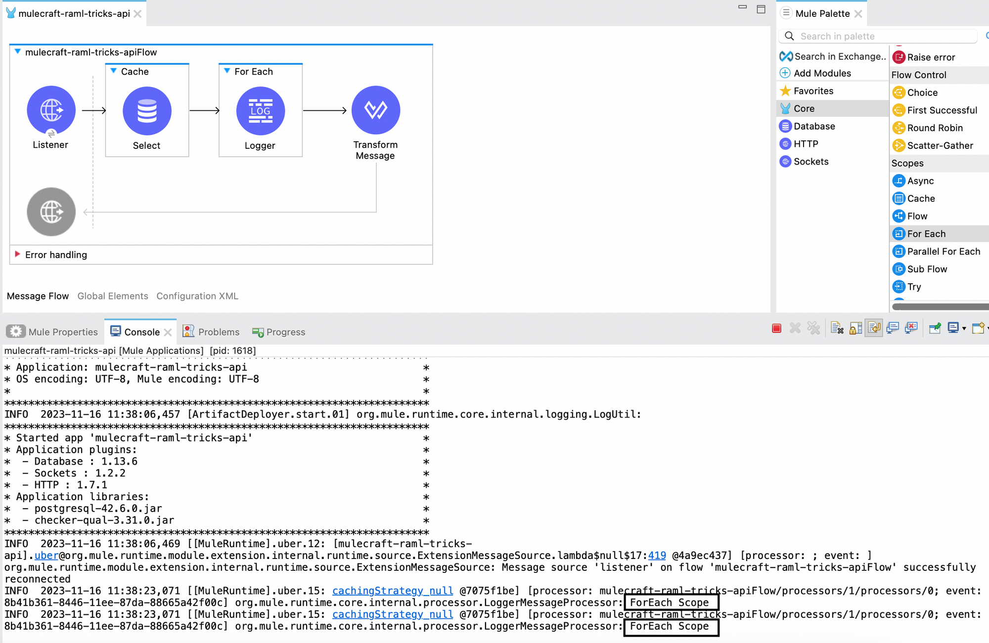 Here, the Select connector causes an error, thus the Logger component next to it is not executed. The On Error Propagate executes, and the message of the logger is printed in the console.