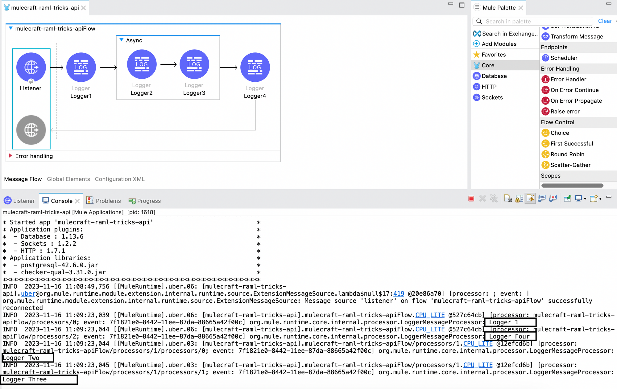 In this image, we could see that after Logger1, Logger Four is processed without waiting for Logger Two and Logger Three to complete processing. The connectors inside the async scope will not delay the processing, whereas they will be processed in parallel along with the rest of the process.