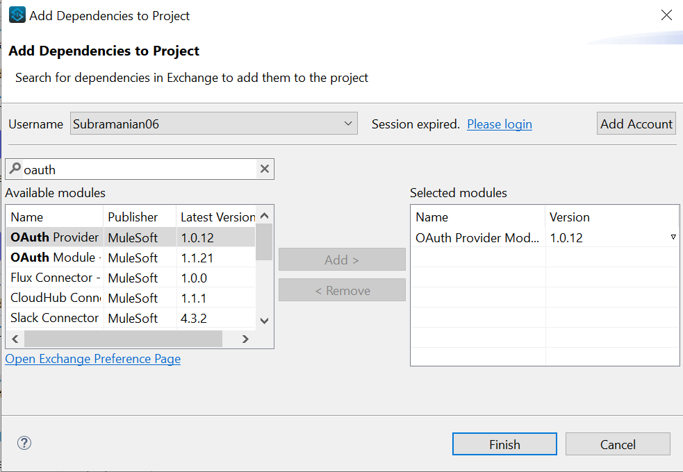 - Search and add Oauth 2.0 provider module from Anypoint Exchange.