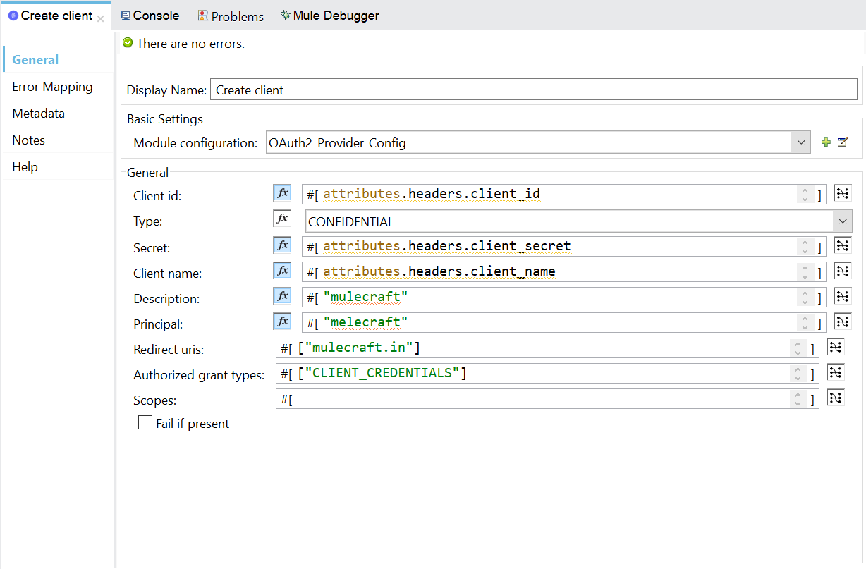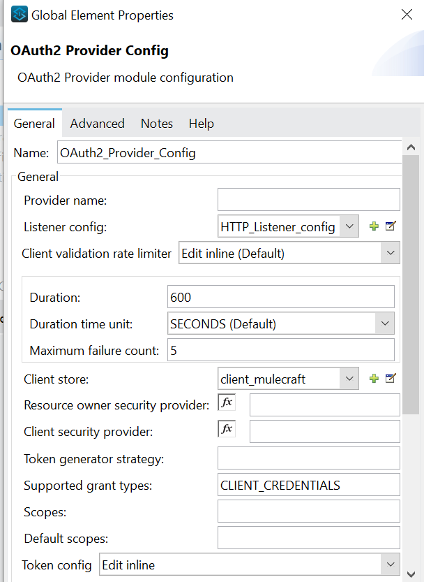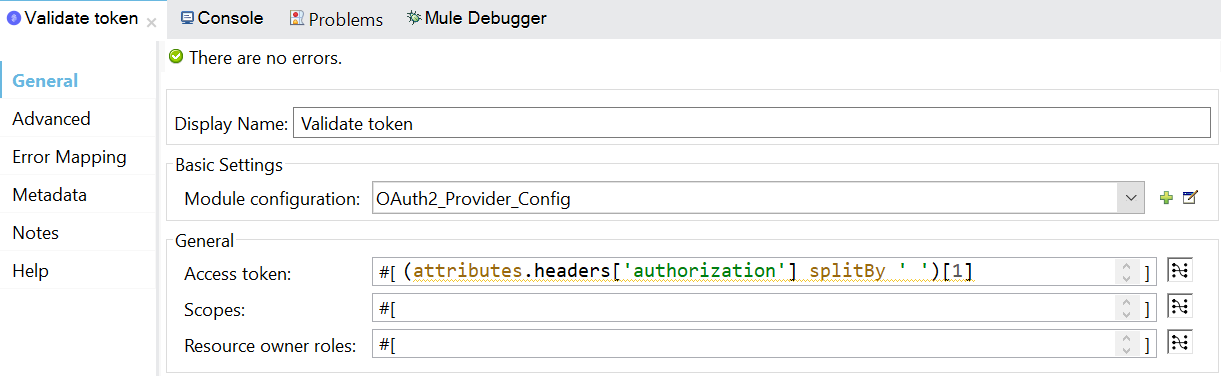 - Listener config: HTTP listener configuration through which Mule OAuth 2.0 provider is listening.
