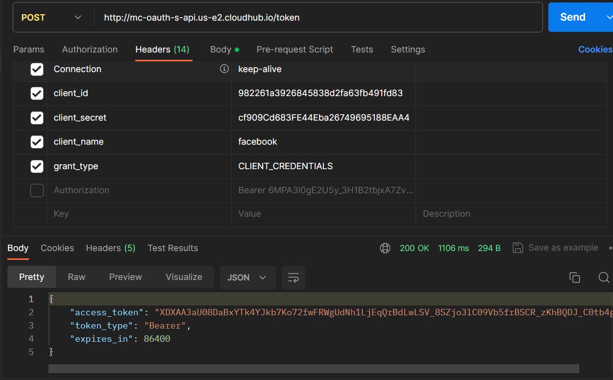 - CLIENT_CREDENTIALS are used as Grant type.
