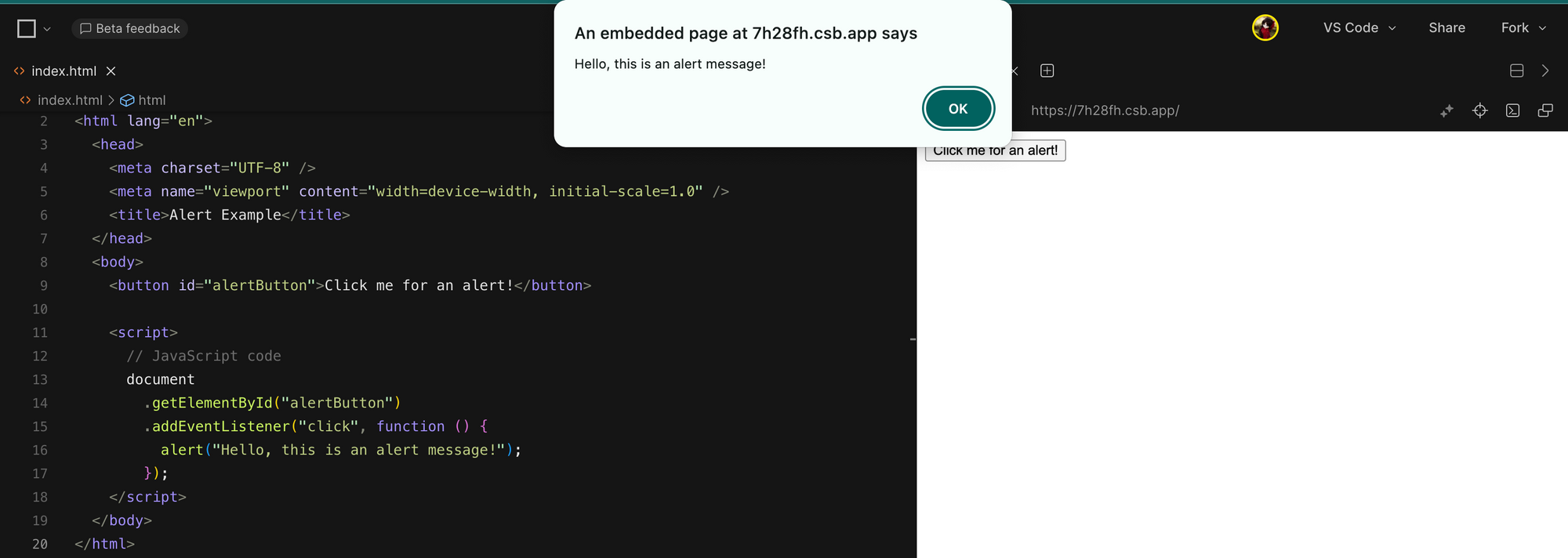 addEventListenerto attach a click event to the button. - When the button is clicked, the event handler function is triggered, which displays an alert message saying "Hello, this is an alert message!"