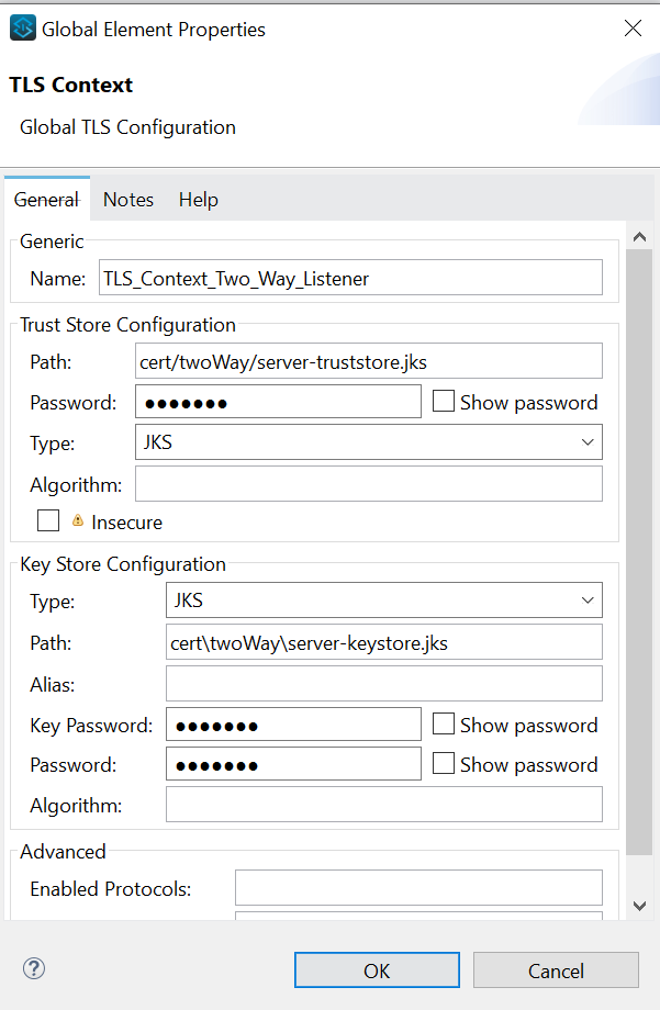 - Globally I have created a Keystore and here are the password, path and type that we used in test for one way listener configuration.
