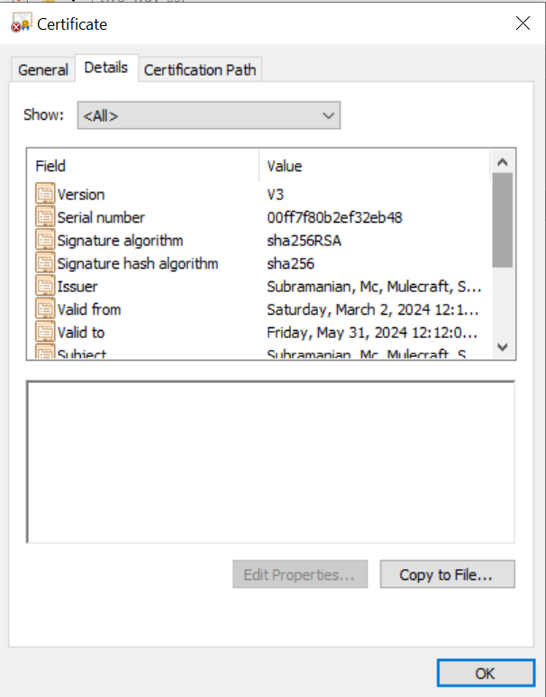 - Now let’s see the details in the certificate, we can see all the information we have given automatically.
