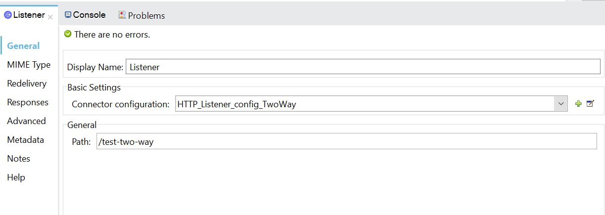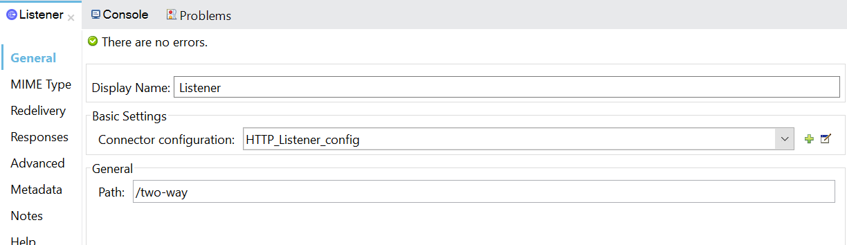 - Configure HTTP Listener Global configuration with default values and set path as /one-way.