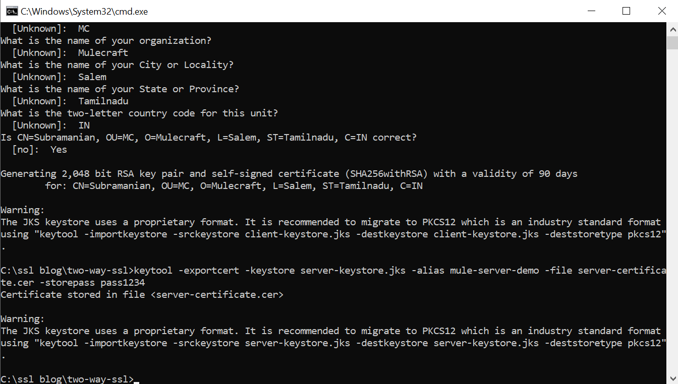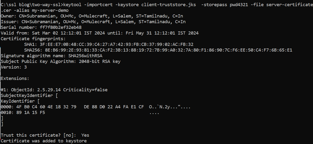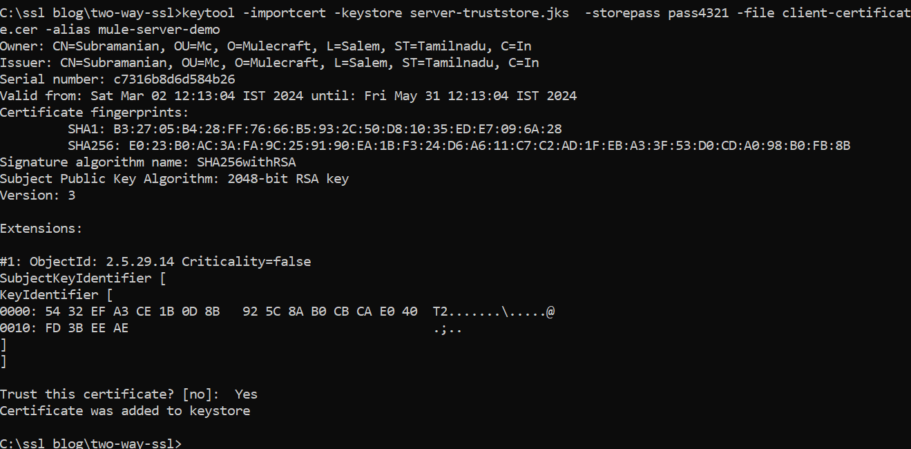 keytool –importcert –keystore server-truststore.jks -storepass pass4321 –file client-certificate.cer -alias mule-server-demo